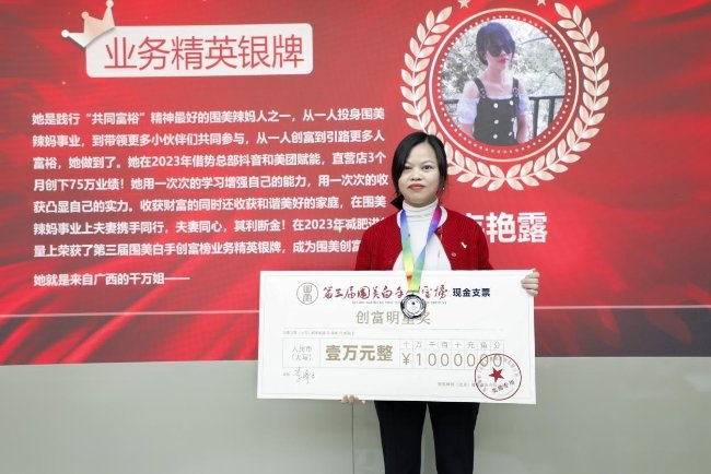 減肥項目類業務精英銀牌——韋艷露:她是踐行“共同富?!本褡詈玫膰览眿屓酥?,從一人投身圍美辣媽事業,到帶領更多小伙伴們共同參與,從一人創富到引路更多人富裕,她做到了。她在2023年借勢總部抖音和美團賦能,直營店3個月創下75萬業績!她用一次次的學習增強自己的能力,用一次次的收獲凸顯自己的實力。收獲財富的同時還收獲和諧美好的家庭,在圍美辣媽事業上夫妻攜手同行,夫妻同心,其利斷金!在2023年減肥進貨量上榮獲了第三屆圍美白手創富榜業務精英銀牌。