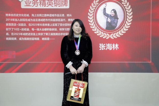 減肥項目類業務精英銅牌——張海林:她來自歷史文化名城、海上絲綢之路申遺城市連云港,她從2018年加入到現在成為連云港減肥市代和面部區縣代,擁有9家直營店+加盟店,在2023年抖音來客上實現了百分百轉化,創下了10萬+的收益,每一場大會都積極參加,將學習貫徹到底。在2023年減肥進貨量上榮獲了第三屆圍美白手創富榜業務精英銅牌。