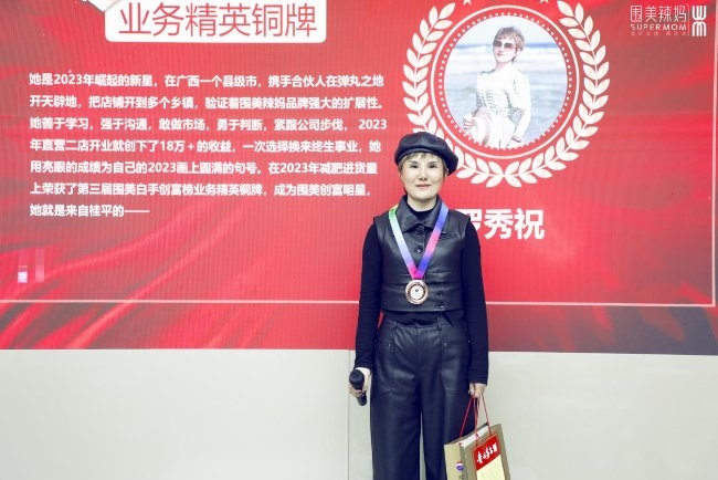 減肥項目類業務精英銅牌——羅秀祝:她是2023年崛起的新星,在廣西一個縣級市,攜手合伙人在彈丸之地開天辟地,把店鋪開到多個鄉鎮,驗證著圍美辣媽品牌強大的擴展性。她善于學習,強于溝通,敢做市場,勇于判斷,緊跟公司步伐, 2023年直營二店開業就創下了18萬+的收益,一次選擇換來終生事業,她用亮眼的成績為自己的2023畫上圓滿的句號。在2023年減肥進貨量上榮獲了第三屆圍美白手創富榜業務精英銅牌。