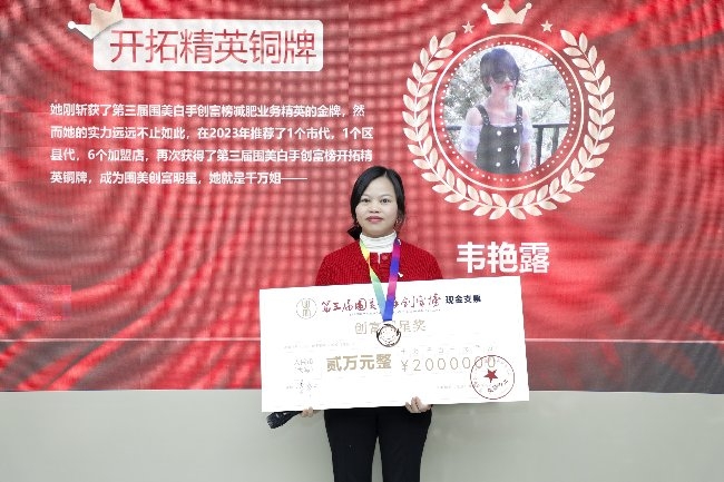 市場開拓類開拓精英銅牌——韋艷露:她已斬獲了第三屆圍美白手創富榜減肥業務精英的金牌,然而她的實力遠遠不止如此,在2023年推薦了1個市代,1個區縣代,6個加盟店,再次獲得了第三屆圍美白手創富榜開拓精英銅牌。