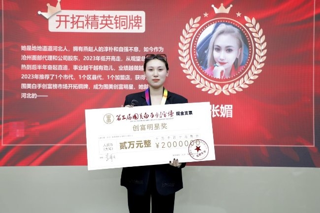 市場開拓類開拓精英銅牌——張媚:她是地地道道河北人,擁有燕趙人的淳樸和自強不息,如今作為滄州面部代理和公司股東,2023年低開高走,從觀望總部線上火熱到后半年奮起直追,事業越干越有勁兒,業績越做越火爆,在2023年推薦了1個市代,1個區縣代,1個加盟店,獲得了第三屆圍美白手創富榜市場開拓銅牌。
