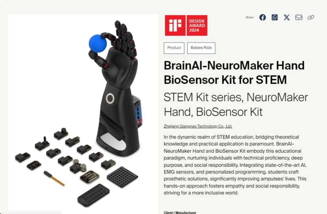 腦機(jī)接口技術(shù)的發(fā)展涉及多學(xué)科交叉融合,其中產(chǎn)品設(shè)計(jì)就是重要的組成部分,強(qiáng)腦科技致力于打造更符合用戶需求的腦機(jī)接口產(chǎn)品,給到用戶更佳的使用體驗(yàn)。在此次iF獲獎前,強(qiáng)腦科技研發(fā)的智能仿生手產(chǎn)品和開星果腦機(jī)接口社交溝通訓(xùn)練系統(tǒng)就憑借創(chuàng)新的產(chǎn)品思維和出色的人機(jī)交互體驗(yàn),獲得了國內(nèi)外多項(xiàng)設(shè)計(jì)大賽的認(rèn)可,包括紅點(diǎn)至尊獎及中國設(shè)計(jì)智造大獎(DIA)金獎等。