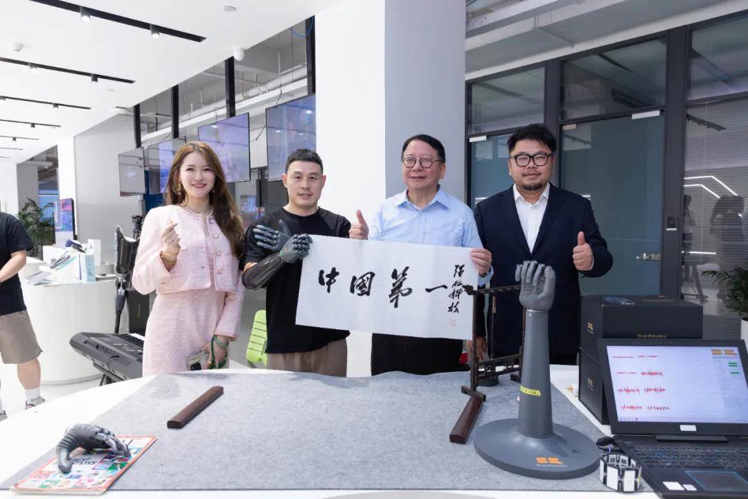 陳國(guó)基(右二)觀(guān)看智能假肢寫(xiě)書(shū)法的展示