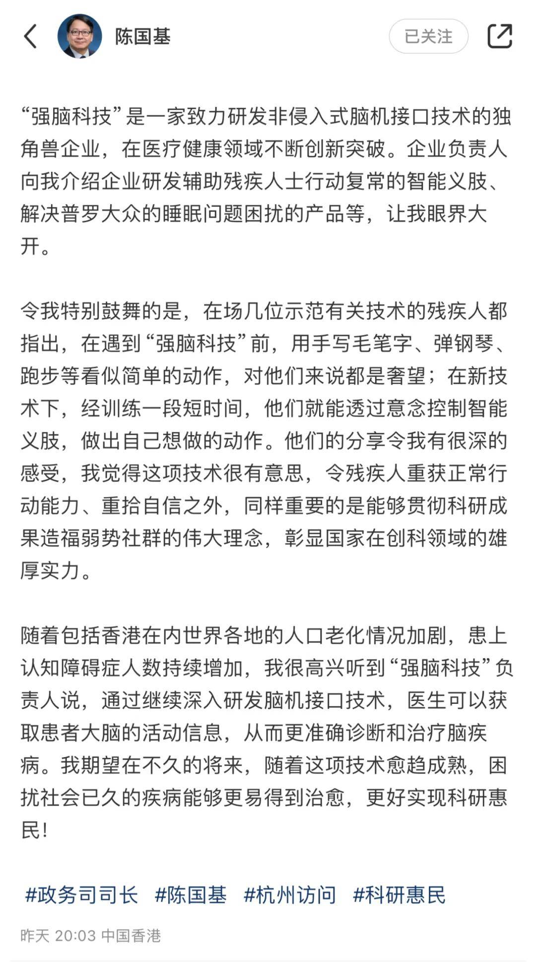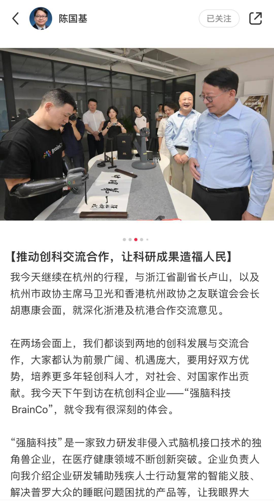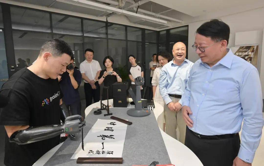 8月13日下午,陳國(guó)基到訪(fǎng)中國(guó)(杭州)人工智能小鎮(zhèn),參觀(guān)BrainCo強(qiáng)腦科技,了解其非侵入式腦機(jī)接口技術(shù)的最新發(fā)展,并觀(guān)看智能仿生手寫(xiě)書(shū)法和彈琴、智能仿生腿走路等方面的展示。他欣悉相關(guān)創(chuàng)新科學(xué)技術(shù)讓殘疾人士通過(guò)“意念”控制外在裝置,得以重獲行動(dòng)能力、進(jìn)行日常活動(dòng),貫徹科研成果造福人民的理念。他亦鼓勵(lì)在浙企業(yè)利用香港優(yōu)越營(yíng)商環(huán)境、創(chuàng)新發(fā)展機(jī)遇和豐富多元人才庫(kù),以香港作為推進(jìn)創(chuàng)科合作、拓展國(guó)際市場(chǎng)的據(jù)點(diǎn)。