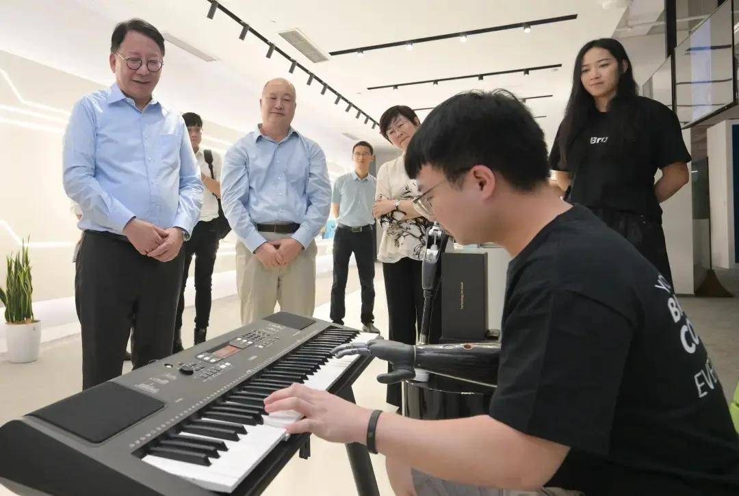 陳國(guó)基(左一)觀(guān)看智能假肢彈琴的展示