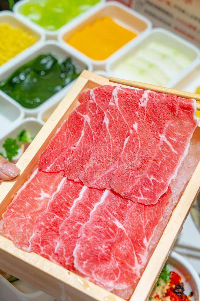 而且不同于很多火鍋店的肥牛是“卷”,一圍的肥牛是進口凍鮮牛肉,一整塊牛肉在門店現點現切,一片片擺在盤子里的,鮮紅的紋理,非常新鮮,價值感很高。