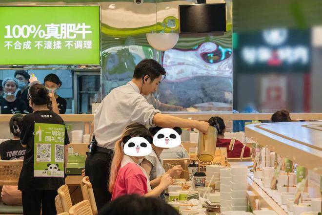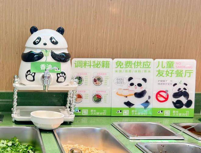 雖然說餐飲業用熊貓做IP的品牌并不少見,但是一圍把熊貓這個視覺符號用到了極致:門口粉色腮紅的熊貓立牌、熊貓慕斯蛋糕、服務員帽子上趴著個小熊貓、各種熊貓周邊……甚至連裝香油的瓶子都是熊貓樣式。