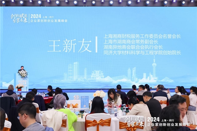 本次峰會以“創新賦能,智享未來”為主題,旨在緊扣時代脈搏,引領著當下創新創業的潮流,推動經濟發展凝心聚力。在本次活動中,上海湘商財稅服務工作委員會名譽會長/上海市湖南商會常務副會長-王新友會長,發表了重要致辭,他強調創新創業不僅是企業發展的必然選擇,更是推動社會經濟進步的重要力量。在創業的道路上相互扶持,共同面對,開創一個互利共贏的新局面。希望通過本次峰會創造的寶貴機會和平臺功能,各位能夠打破界限,合作共贏。