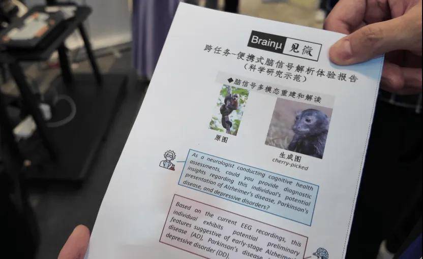 智源大會現場展示環節中,體驗者佩戴腦電信號采集設備觀看一組動物圖片,Brainμ模型隨后對采集的腦電信號進行解析并生成對應的視覺圖像,同時出具腦疾病診斷報告,初步預測體驗者是否存在患精神類疾病的可能,該項技術為未來腦疾病診斷輔助打開了新的可能。