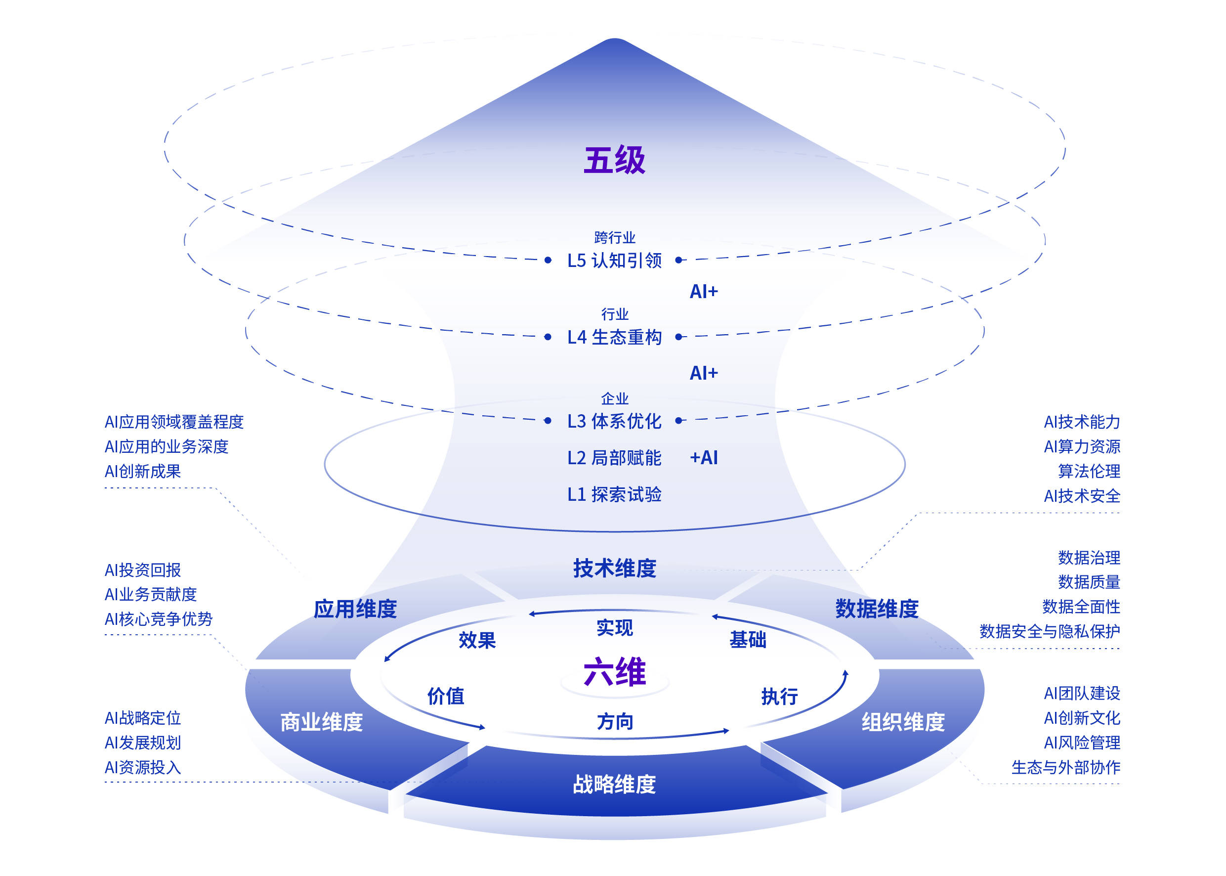 該模型首次提出從“單點試驗”到“AI原生”五大進階等級(L1-L5),并圍繞戰略、組織、數據、技術、應用與商業六大維度,為企業提供系統化的AI落地評估框架與實施路徑,助力企業精準定位現狀、明確轉型方向,實現從“+AI”向“AI+”的價值躍遷。