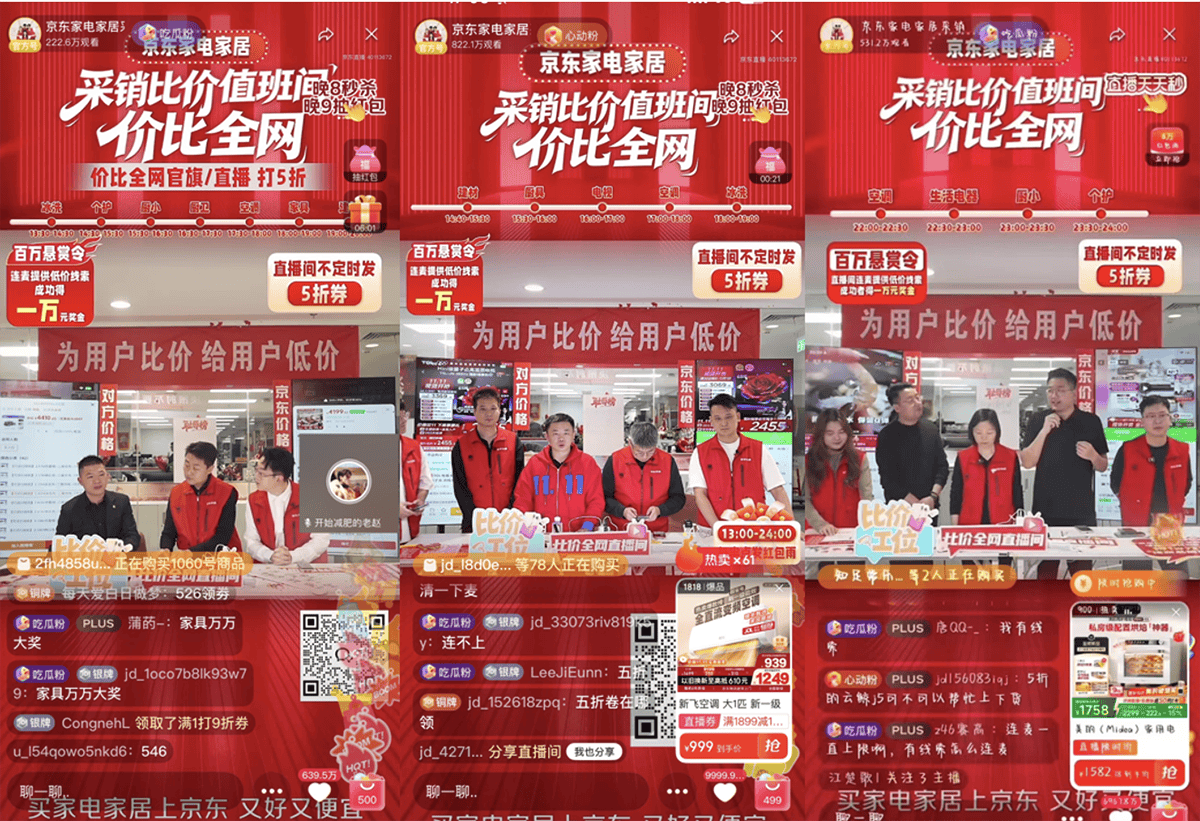 今年11.11,京東家電家居以"真刀真槍"的比價(jià)直播,掀起一場(chǎng)電商行業(yè)的"低價(jià)戰(zhàn)役"。直播間拉起“為用戶比價(jià)、給用戶低價(jià)”的橫幅,正是京東做這次比價(jià)直播的初心,通過“直播連麥比價(jià)”“貴就賠萬元”“現(xiàn)場(chǎng)調(diào)價(jià)打9折”等互動(dòng)機(jī)制,將價(jià)格話語權(quán)交還給用戶,堅(jiān)決捍衛(wèi)消費(fèi)者的低價(jià)權(quán)益。此次京東家電家居比價(jià)直播不僅吸引千萬用戶觀看,更獲得美的、海爾、海信、TCL、芝華仕、倍輕松、艾力斯特等品牌負(fù)責(zé)人親臨直播間,現(xiàn)場(chǎng)力挺京東為用戶比價(jià)。